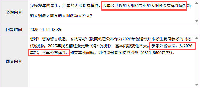 根据考试院回复:2026年专升本报名前还会更新《考试说明》,基本内容变化不大。但是!从2026年起将不再公布样卷!