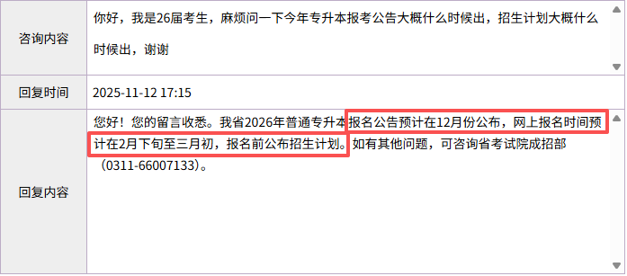 根据考试院回复:2026年专升本报考公告预计在12月份公布,报名时间预计在2月下旬至3月初,招生计划在报名前公布。
