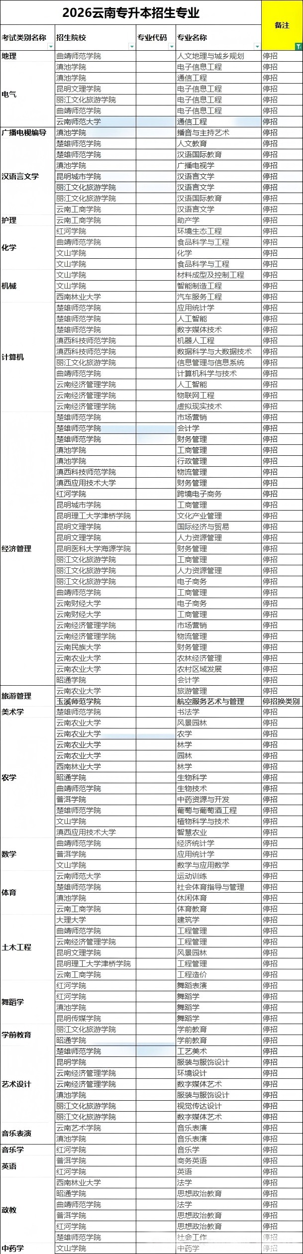 2026年云南专升本招生格局迎来重大调整,多所院校专业停招引发考生关注。根据云南省招考院及多所院校发布的最新政策,2026年云南专升本停招专业涉及经济管理、农学、计算机等多个大类,部分公办院校停招力度较大,考生需及时关注政策变化以调整备考方向。