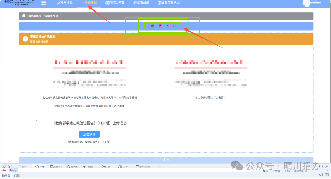 (1)点击“资格审核”页面的“缴费入口”,用微信扫描缴费二维码,输入正确的身份证号、手机号和姓名进行缴费;