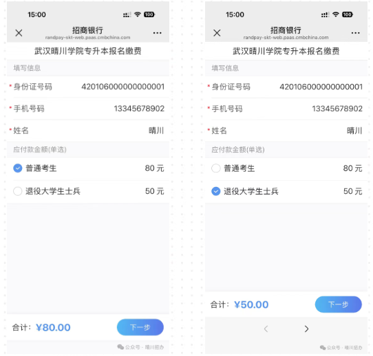 (2)普通考生选择“普通考生”,缴费金额80元/生;退役大学生士兵选择“退役大学生士兵”,缴费金额50元/生。(3)通过微信支付完成缴费,缴费成功后请截图保留支付凭证。