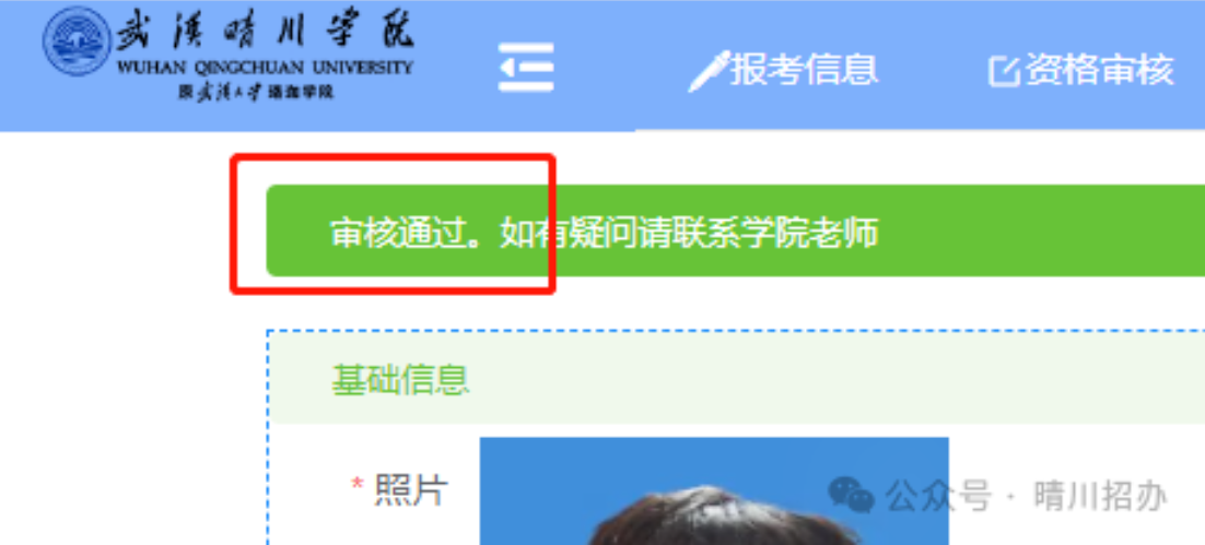 学校审核结束后,考生登录校平台,点击“报考信息”,即可在考生照片的左上方看到审核结果,审核通过的考生可于4月10日-17日再次登录校平台打印准考证。