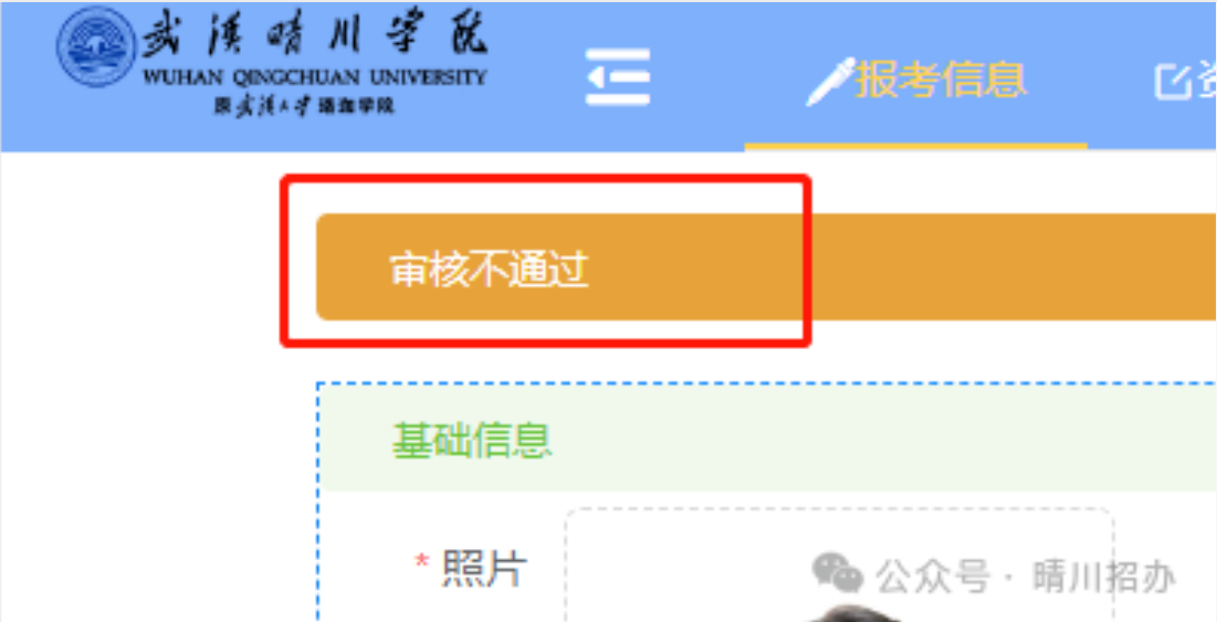 2.部分考生因未按要求提交资料或未缴纳报名费,按自动放弃报名资格处理。审核结果为“审核不通过”,如下图所示: