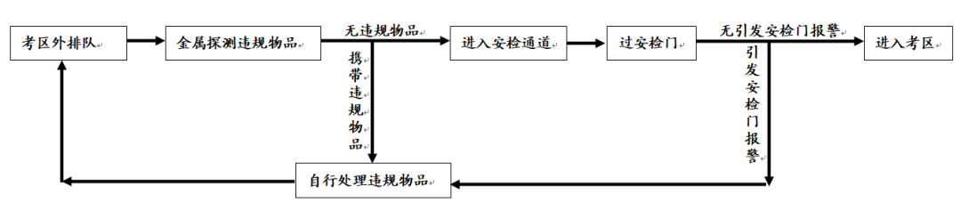 2.考生凭本人《准考证》、有效身份证件按规定时间和地点参加入场模拟演练和考试,必须接受智能安检门检查和“无声入场”检查,无报警声响且无其他考试违禁物品方可进入考点考场。报警提示为不合格,考生自行处理禁带物品后重新接受检查。因疾病或身体原因需要带入的特殊物品(体内植入的金属材料、心脏起搏器、假牙等),须按要求提供体内植入特殊物品证明。