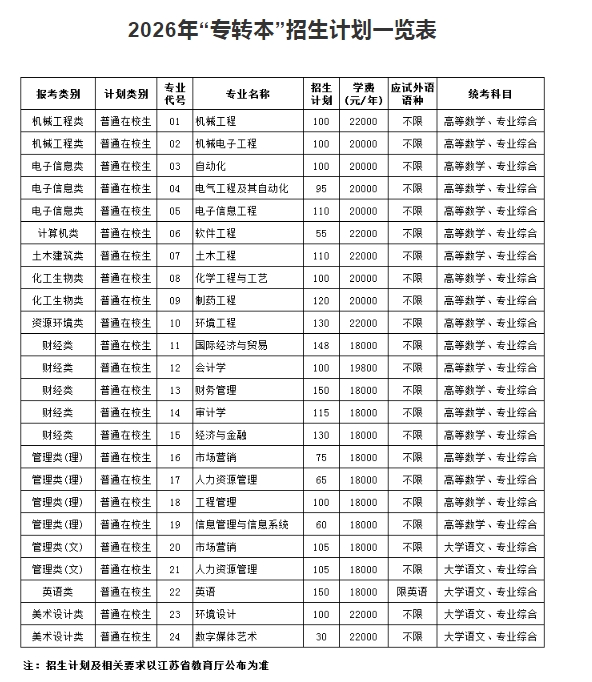 2026年“专转本”招生计划详见附表,以江苏省教育厅公布为准。退役大学生士兵计划另行公布。