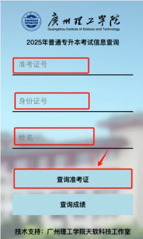 第一步,进入“广州理工学院招生网”,打开栏目“普通专升本”,点击“准考证打印”进入查询页面。