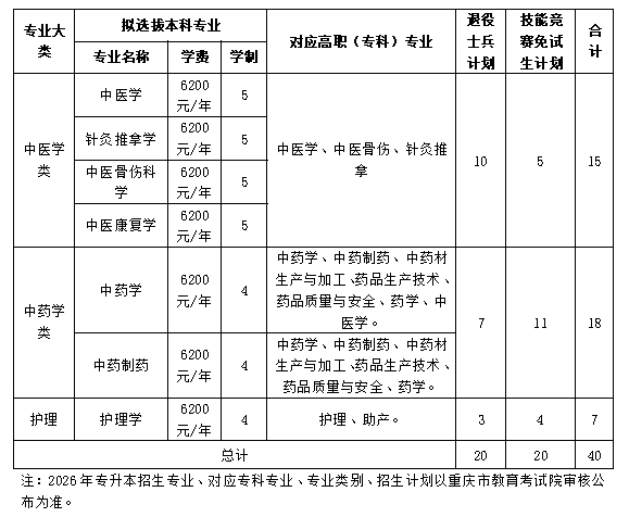 根据《重庆市教育委员会 重庆市退役军人事务局关于印发2026年重庆市普通高校专升本免试招生工作实施方案的通知》(渝教学发〔2026〕1号)文件精神,2026年我校在普通高校专升本总计划中分别单列退役大学生士兵计划20人,技能竞赛免试生计划20人。共有7个本科专业,分为中医学类、中药学类、护理3个大类进行招生,各专业大类不设分专业计划,具体招生专业及招生计划如下: