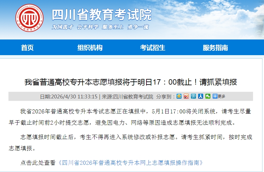 我省2026年普通高校专升本考试志愿正在填报中,5月1日17:00将关闭系统,请考生尽量早于截止时间前2小时提交志愿,避免因电力、网络等原因造成志愿填报无法顺利完成。
