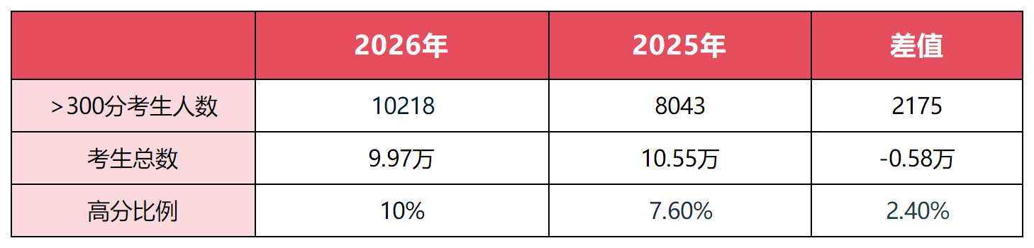 超过400分的考生有62人,相较往年上涨195%;300分以上的考生人数较去增加990人,上涨比例约24%。