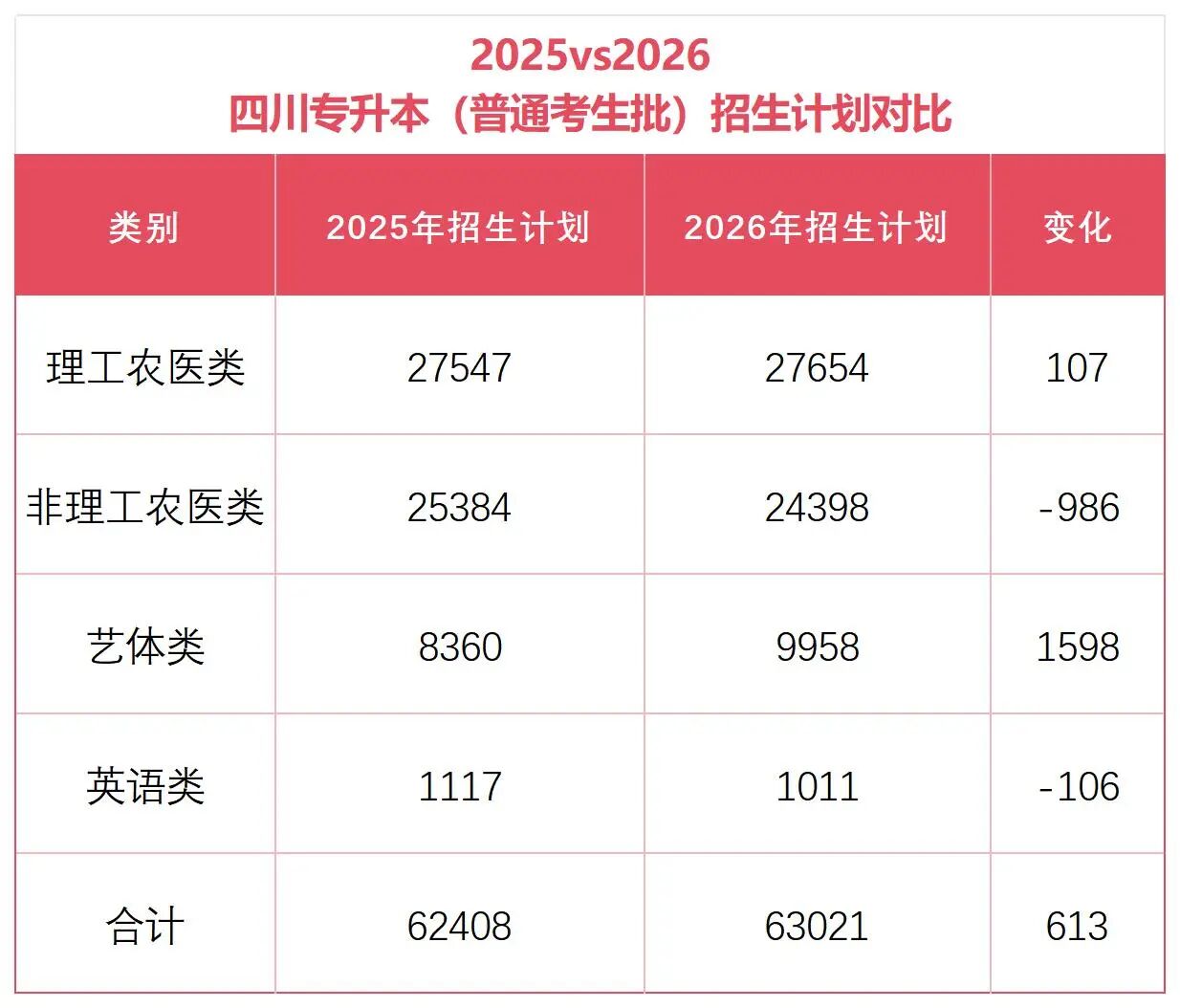 总体情况:2026四川专升本招生计划总数为63021,相较往年增加613人,整体略有扩招(+0.98%)